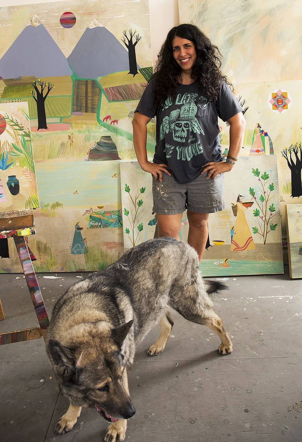 Deedee Cheriel paints colorful narratives depicting mythological characters interacting in simple timeless environments. She pulls imagery and decoration from colonial America, Egypt and India. She works with themes of communication, fear and connection.
